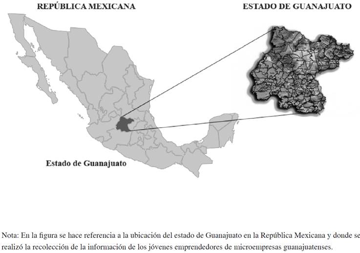 El tipo de muestreo fue no probabilístico intencional, debido a que se requería obtener el mayor número de microempresas participantes. En el marco de muestreo empleado en la presente investigación, fueron sujetos de investigación jóvenes emprendedores, líderes de proyectos de micro organizaciones empresariales industriales, comercio y de servicio de la región del bajío del estado de Guanajuato, México (Ver Figura 1). Los criterios de inclusión fueron jóvenes emprendedores de microempresas que contaran al menos de un año de experiencia en el emprendimiento de un negocio, producto o servicio. Para recolección de los datos, se diseñó una plataforma alojado a un servidor de internet donde los participantes ingresaron para contestar los instrumentos empleados para su análisis cuantitativo. De tal manera, que se aplicaron los instrumentos a los 407 jóvenes emprendedores de microempresas en el periodo correspondiente al día 9 de Julio del 2018 al 13 de Abril del 2019.