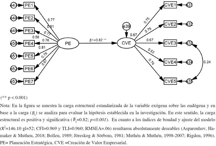 A través de los resultados obtenidos del modelo SEM (ver Figura 1) se demuestra que la planeación estratégica es un factor que influye positiva y significativamente sobre la creación de valor (β1=0.82; p<0.001). En este sentido, se cuenta con suficiente evidencia estadística para afirmar que la planeación estratégica es un factor influyente en la creación de valor en las microempresas de la región del bajío del estado de Guanajuato, México. Por lo tanto, no se rechaza la hipótesis H1.