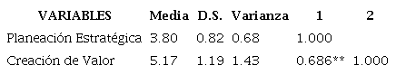 De acuerdo con los resultados obtenidos por medio del análisis estadístico realizado a través de la correlación entre las variables latentes estudiadas, se demuestra que existe una correlación positiva y significativa (r = 0.686; p<0.001) entre las variables de la planeación estratégica y la creación de valor las empresas medida a través del coeficiente de correlación de Pearson (Bonett y Wright, 2000; Pearson, 1929, 1931). Por lo tanto, existe suficiente evidencia estadística para afirmar que la planeación estratégica y la creación de valor empresarial están fuertemente relacionadas entre sí. En este sentido, no se rechaza la hipótesis H2, ver Tabla 1.