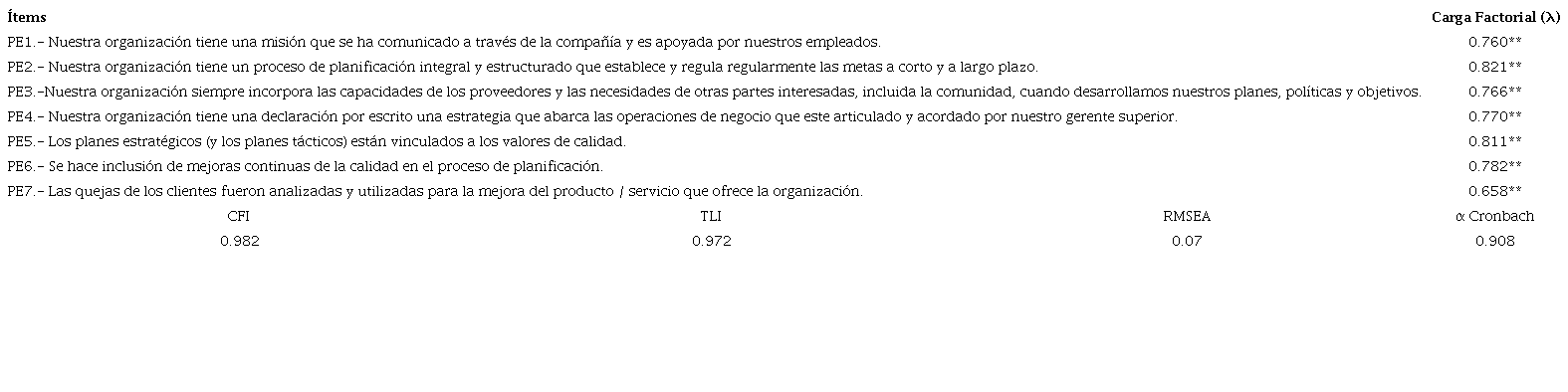 2.2.1 Planeación estratégica. Para medir este constructo de los jóvenes líderes emprendedores, se empleó la dimensión de planeación estratégica del instrumento de prácticas de gestión empresarial TQM (ver Anexo) desarrollado por Ahire, Golhar y Waller (1996). Este instrumento está conformado por 7 ítems. Los reactivos tienen un formato tipo Likert con 5 puntos de repuesta, donde 1 representa “Totalmente en desacuerdo” y 5 “Totalmente de acuerdo”. Para evaluar la confiabilidad de este instrumento se empleó el Alfa de Cronbach (α=0.908), misma que resultó satisfactorio (Cronbach, 1951; Hair et al., 2017).