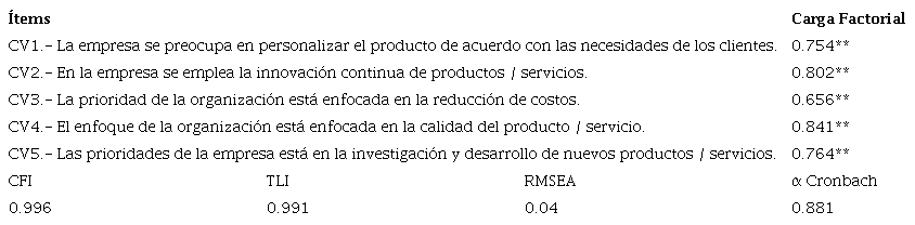 2.2.2 Creación de Valor. Para medir este constructo, se empleó la dimensión del rendimiento no financiero del instrumento resultados del rendimiento (ver Anexo) adaptado por Noordin et al. (2015). El instrumento está conformado por 5 ítems. Los reactivos tienen un formato tipo Likert con 7 puntos de repuesta, donde 1 representa “pobre rendimiento” y 7 “excelente rendimiento”. Para evaluar la confiabilidad de este instrumento se empleó el Alfa de Cronbach (α=0.881), misma que resultó satisfactorio (Cronbach, 1951; Hair et al., 2017).