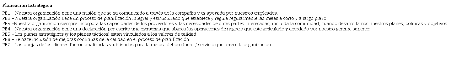 Debido a la relevancia que tiene el uso y aplicación de la planeación estratégica dentro del sector empresarial, representa una de las prácticas de la gestión y dirección administrativa de la empresa (Jaafreh & Al-abedallat, 2013; Ooi, 2014; Shammari & Hussein,2008) que contribuye en el método de gestión de calidad de Deming a través las prácticas de gestión de una empresa (Deming, 1986). Así mismo, es uno de los constructos que conforma la gestión de la calidad total (TQM: Total Quality Management), por lo que es medida a través del instrumento TQM (Lee et al., 2012, Prajogo & Sohal, 2003) desarrollado por Ahire, Golhar y Waller (1996).