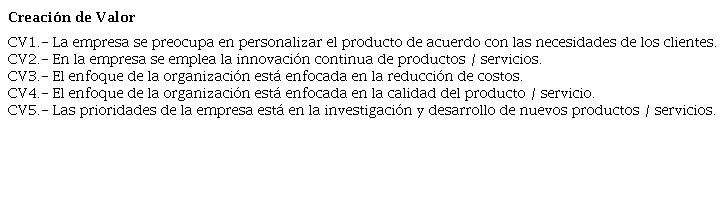 De acuerdo con Sánchez y Cerdán (2002), actualmente las empresas enfrentan un nuevo escenario competitivo, donde la creación de valor empresarial surge a partir de la capitalización de los activos intangibles que ofrece la empresa. En este sentido, se hace referencia al servicio, la flexibilidad en entregas de productos, correcciones en los volúmenes de producción, la calidad en el desarrollo de productos y la prestación de servicios (Cousens et al., 2009; De Toni & Tonchia, 1998), entrega a tiempo, y la calidad ofrecida a través de los productos y servicios (Prajogo & McDermott, 2008; Coelho & Augusto, 2010).