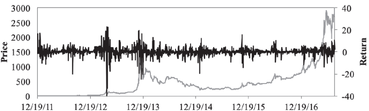 The data sample consists of daily prices, pt , of Bitcoin per US dollar (B/US) from 12/19/2011 to 08/07/2017 for a total of 2,059 daily observation. The data was obtained from http://data.bitcoinity.org. The original data was transformed into series of continuously compounded percentage returns, in accordance with the following expression: rt =100 · ln(pt -pt-1 ) where rt is the return of the series of the B/US in period t, pt is the closing B/US price in period and is the closing B/US price in period t, and pt-1 is the closing B/US price in period t-1. Fig. 1 shows the time series of pt and rt . The returns of B/US show that there might be different periods of volatility.