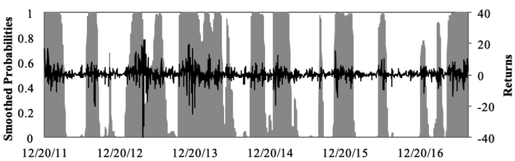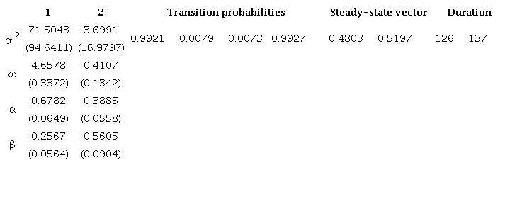 These results show that the transition probabilities are above 0.99, very close in both regimes, which indicates a high persistence. The probabilities of the steady state are of 48.03% for the high volatility, and of 51.97% for the low volatility, these are in 48% of the sample of the data in high volatility. The duration that remains in each state is 126 days and 137 days, respectively. Therefore, the high persistence of each state shows that once there is a change of state, the volatility of the returns remains on high or low conditional volatility for several periods of time.