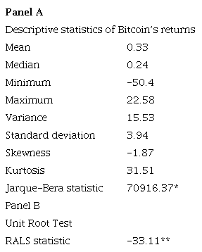 The time series behaviour of Bitcoin’s price has received a lot of attention lately. There is still a debate on the proper definition of its nature and to whether it is a currency, a commodity or something in between (Dyhrberg, 2016; Yermack, 2015). In order to be considered a currency, it should fulfil the main standard properties of being a unit of account (there are no financial statements valued in Bitcoins), a medium of exchange (it is accepted mainly for some online purchases) and it might be difficult to believe that, given the great swings in price of Bitcoin, anyone can consider Bitcoin as a suitable option to store value (Dwyer, 2015).