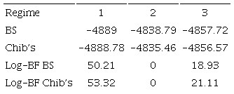 However, to discriminate between different GARCH models with or without state changes, Bauwens et al. (2014) suggested a Bayesian methodology that estimates the possible number of states or regimes using the Bayes Factor (BF) criterion, maximizing the value of the marginal likelihood. The simulation technique is based on Monte Carlo Particle Markov Chains (PMCMC), which combines a Sequential Monte Carlo (SMC) and Markov Chains with Monte Carlo Simulation (MCMC), see (Bauwens et al., 2014) for all details of the methodology.
