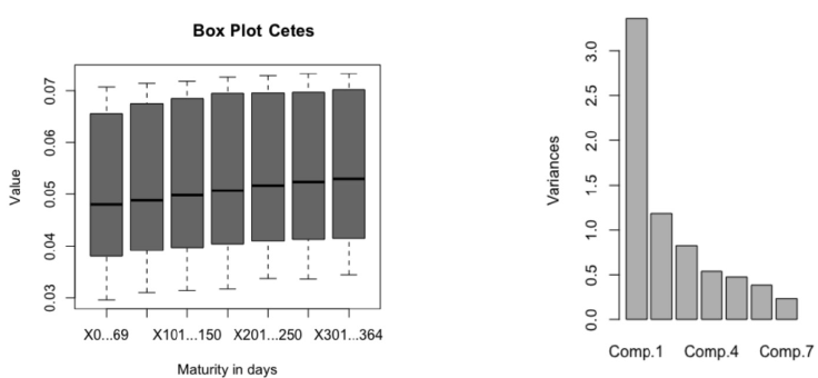Once the principal components are obtained, the problem is reduced to computing a diagonal variance-covariance matrix of dimension 3x3 and then it is possible to compute the variance of the yield curve with the matrix trace. The method of principal components (PCA) is a method of multivariate analysis that makes it possible to extract the most important linearly independent data sources. Applying the PCA method to n stationary time series, it is possible to obtain n stationary and orthogonal series called principal components. At the same time, this methodology makes it possible to know what percentage of the variance is explained by each component. In the following analysis four of the most important yield curves for the Mexican market were used. The data for the analysis correspond to the market information from October 2015 to November 2017 for the following yield curves: