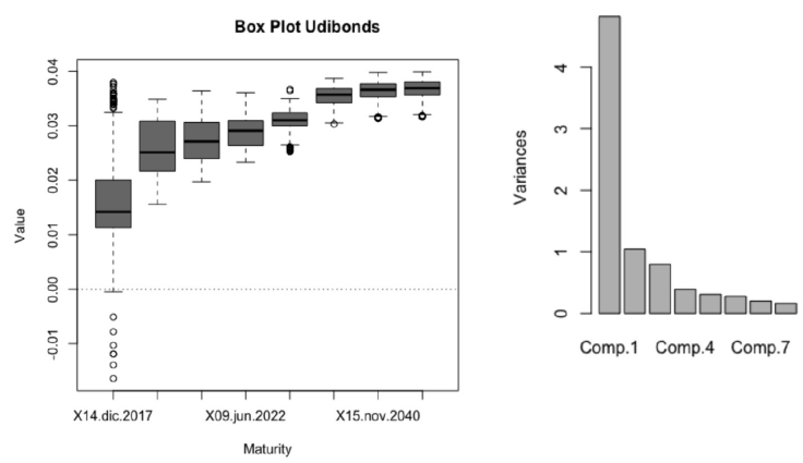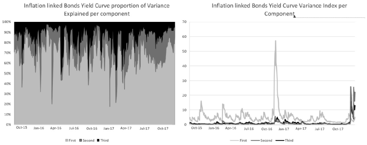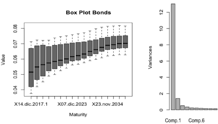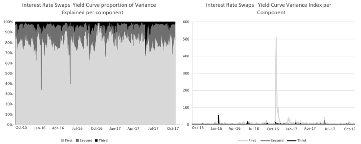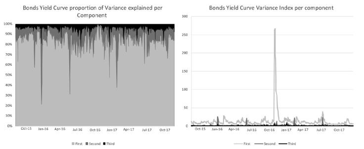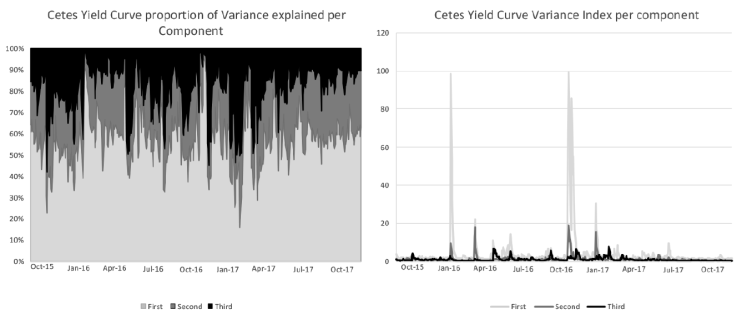 It is observed that the first and second components have the highest volatility and react to the changes in monetary policy and that in November 2016 the variance of each component reached its maximum after the United States Presidential Elections. The first component that represents the parallel shift accounts for more than 60% of the variance. In addition, it is observed that in general there is no high volatility in this market.