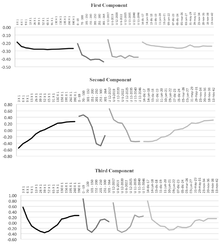 The second component corresponds to the slope of the curve. The factor loadings of the second component have a monotonic change with maturities: changes in long-maturity and short maturity have opposite signs. The second factor consequently accounts for the “slope” across maturities. Even this behavior is consistent in all the markets: the monotonic behavior is increasing for interest rates and bonds and decreasing for the Cetes and inflation-linked bonds.