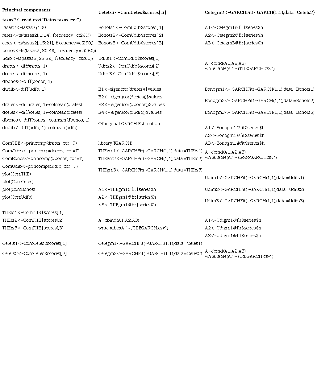 Section II contains the literature review. In section III, the description of the data and an analysis of principal components were performed for four yield curves: zero-coupon bonds, nominal bonds (M-bonds), inflation-linked bonds (Udibonos) and TIIE interestrate swaps. In section IV, a GARCH(1,1) was adjusted. It was decided to use a GARCH(1,1) because this model tends to be a standard. With these estimations, and using the orthogonality of the variable, it is possible to obtain the square root to obtain the volatility of the yield curve or even that of all the fixed-income market.
