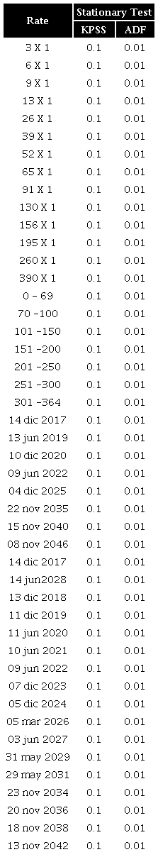 Zero-coupon bonds (Cetes): These are the simplest kind of fixed-income securities. The Federal Government issues these securities every week for the Cetes with maturity of 28, 91, and 182 days, and every four weeks for the Cetes with maturity of 364 days. In order to have a time series for different constant maturities and taking into consideration the low liquidity of these assets, the following maturities intervals were used: 0-69, 70-100, 101-150, 151-200, 201-250, 251-300, and 301-364 days. Each interval represents the maturity in days of the Cetes that can be compared in order to have a reference rate for each interval in the case of some securities that did not have any operations on a particular day. The data are obtained from the weighted average rate traded by brokerage houses and published by Banco de México on its web site for these intervals.