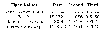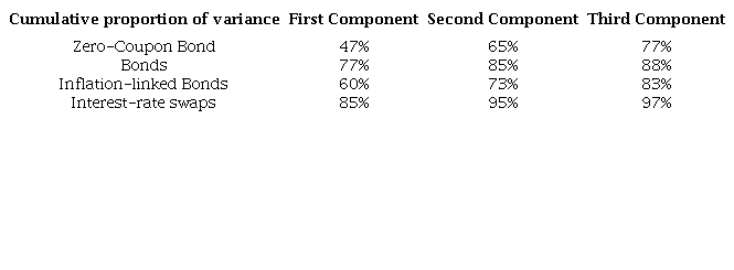 Another important property of the use of principal components is that the sum of the variances of the transformed variables is the sum of the eigenvalues. This property will be used for the construction of the indicator of volatility for the different yield curves in the following sections.
