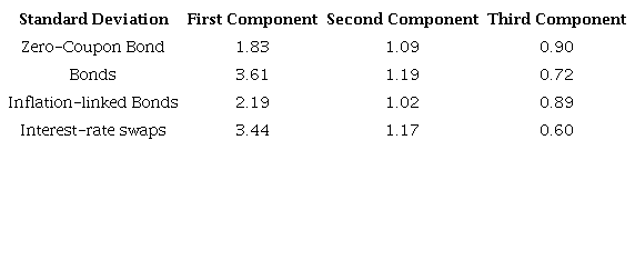 The third component is the curvature. The factor loadings of the third component are different for the mid-term rates and the average of long- and short-term rates, revealing a curvature resembling the convex shape of the relationship between the rates and their maturities.