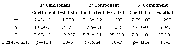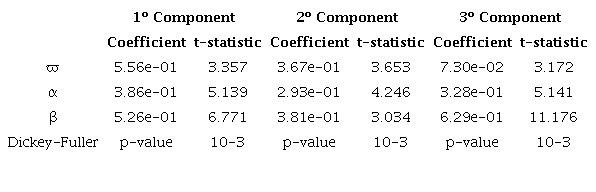 For the analysis of the Zero-Coupon Bond Curve, a GARCH(1,1) was adjusted for each of the first three principal components. The estimation was significant for each parameter and for the three GARCH models. The Dickey-Fuller test was also performed in order to test stationarity.