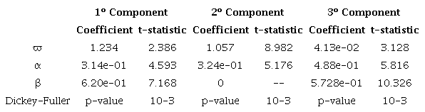 Three univariate GARCH models that comprise the diagonal matrix of variances were estimated by this method. For this estimation a GARCH (1,1) with normal distribution is used. The GARCH (1,1) was selected because it is a model commonly used in the literature and because of existing empirical evidence that GARCH models with higher parameters do not substantially improve the precision of estimates, so it was deemed preferable to work with a simpler model: