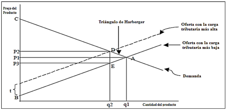 El efecto de la tributación en la economía es destacado por el triángulo de Harberger, en lo que se refiere al estudio resultante del deadwirght loss (exceso de peso o ineficiencia alocativa) causada por los impuestos en los mercados debido a la intervención gubernamental, generando pérdidas en la recaudación tributaria por ineficiencia económica. Se observa que, en la línea de la curva de la demanda y oferta, la forma triangular gana forma con el cambio de la incidencia tributaria como un tercer vértice, donde es posible vislumbrar que cuanto mayor sea la intervención tributaria del gobierno menor será la cantidad consumida, debido a la retracción de la demanda ante el aumento de los precios de los bienes y servicios ofrecidos derivada de la elevación de los tributos (Harberger, 1995).