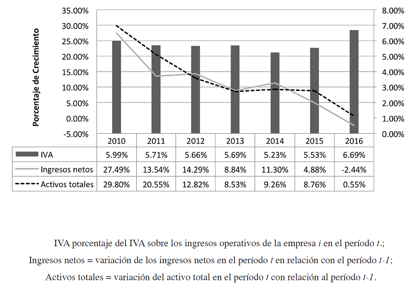 Así, se propuso el análisis del crecimiento en dos dimensiones: el crecimiento de los ingresos y el crecimiento de los activos. Por último, para establecer el análisis del impacto del IVA, y su aumento, en el crecimiento de las empresas, se construyó una variable representativa de las dos dimensiones de crecimiento, en un análisis por componentes principales, por intermedio de la transformación ortogonal, con la mayor varianza posible, entre el crecimiento de los ingresos de los activos totales.
