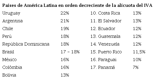 La alícuota media del IVA en América Latina está en torno al 15%. La mayor tasa se encuentra en Uruguay, con un 22%, incidido por casi todos los bienes y servicios consumidos dentro de su territorio, y en Argentina, con el 21%, el cual corresponde al impuesto más significativo para sus finanzas, siendo de atribución de la Administración Federal de Ingresos Públicos (AFIP) recogerlo. Los países con el menor porcentaje son Paraguay (10%) y Panamá (7%). Cuba es uno de los países que no cobra el IVA y Puerto Rico lo introdujo en 2016 (Seitz, 2015).