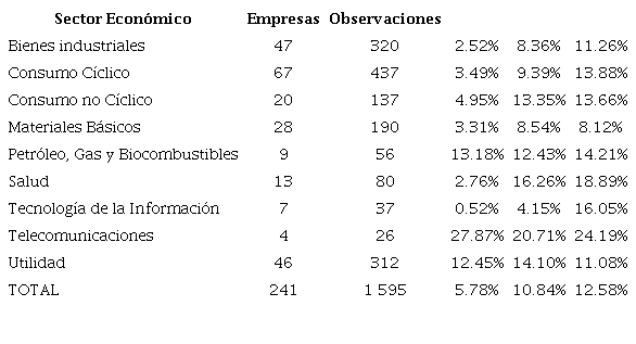 La muestra conteniendo 1,595 observaciones, relativas a 233 empresas, entre los años 2010 y 2016, está distribuida en 9 sectores económicos, utilizando la clasificación de la B3, según se describe en la Tabla 2.