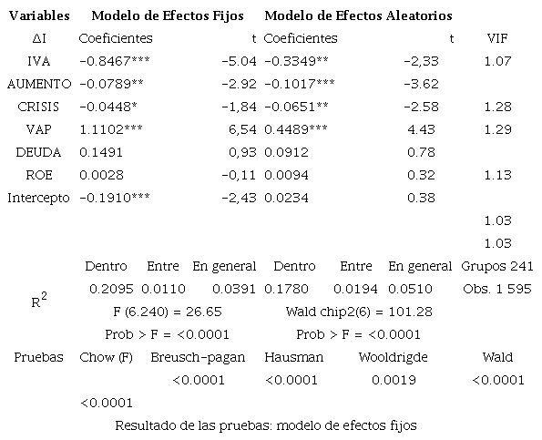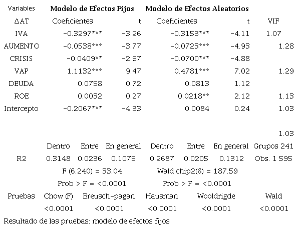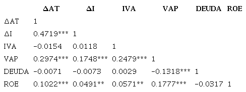 Se observa en esta Tabla 3 que, en la media de la muestra, el crecimiento de los ingresos (ΔR) fue del 12.80%, el crecimiento de los activos totales (ΔAT) fue de 12.58% y porcentaje del IVA sobre los ingresos de las empresas (IVA) fue del 5.78%. El valor agregado producido por las empresas (VAP), en la media de la muestra, quedó en el 31.78%, el apalancamiento (ALAV) en el 31.25% y el retorno sobre el patrimonio neto (ROE) en el 39.82%.