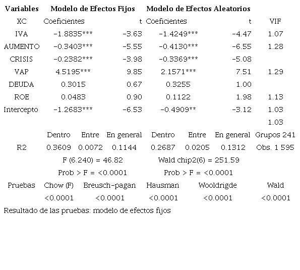 A continuación, según la Tabla 6, el valor agregado producido (VAP) presentó una relación positiva (4.5195) y significativa, en el nivel del 1%, con el XC. Altas tasas de generación de riqueza influencian positivamente en el crecimiento de las empresas.