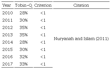 In addition, higher Q ratio value shows successful firm leverage of investment on its firm value in terms of market-value against book value (Al-Matari et al., 2014; Kapopoulos & Lazaretou, 2007). According to Eberhart (2012) and Lang & Litzenberger (1989), firms with Tobin’s Q value that is higher than 1, expanded their opportunities for investment, indicating that management made effective use of its assets for development. However, in the Omani firms context, from the firm performance percentage in MSM (28%, 30%, 35%, 35%, 28%, 30%, 32% and 32%), Tobin’s Q has remained below 1 for the years from 2010 to 2017. Table 1.1 presents the poor performance of the firms.