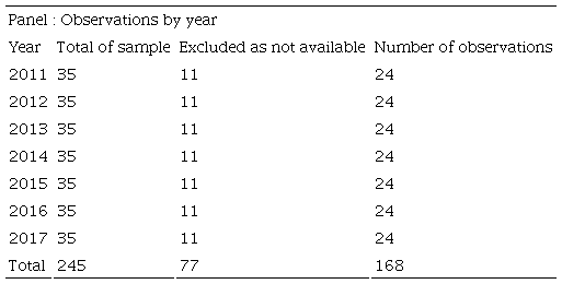 The distribution of the sample financial firms, numbering 35, are presented in Table 3, from where 11 firms were notably excluded for lack of data for the years studied. Owing to the need to balance between panel variable time for the panel data, all the 11 firms were excluded, and as such, the remaining useable firms were 24 studied for the period of 7 years, constituting 168 firm observations. To clarify, this study used panel data set obtained from 24 Omani financial firms constituting 168 observations spanning seven years from 2011 to 2017. The structure of the sample was limited to financial firms as their non-financial counterparts have unique laws that may affect the relationships of the study variables.