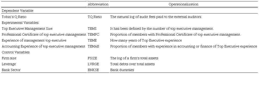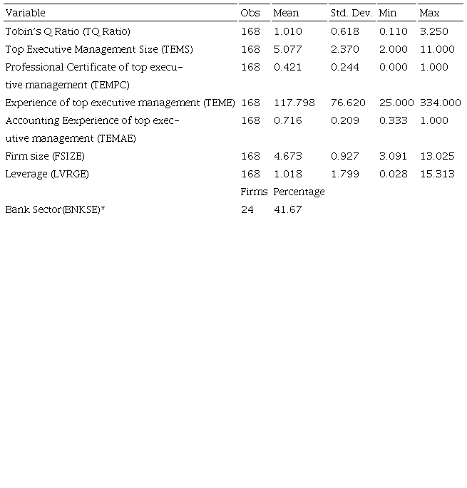 From the above equation, B0 stands for constant, TQ for TQ ratio, TEMS for top executive management size, and TEMPC for top executive management professional certificate. Moreover, TEME stands for top executive management experience, TEMAE for top executive management accounting experience, FSIZE for firm size, LVRGE for leverage, BNKSE for bank sector and lastly, ε stands for error term.
