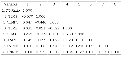 The calculated Tobin’s Q is 1.01% (refer to Table 4), indicating that the mean of the firms TEMS, TEMPC, TEME and TEMAE are 5.077, 0.421, 117.798 and 0.716 in percentage, with a maximum (minimum) of 11.000 (2.000), 1.000 (0.000), 334.000 (25.000) and 1 (0.333) in percentage. As for the control variables namely FSIZE, LVRGE and BNKSE, the mean values were 4.673, 1.018 and 0.417 respectively, with maximum (minimum) values of 13.025 (3.091), 15.313 (0.028) and 1.000 (0.000) respectively.