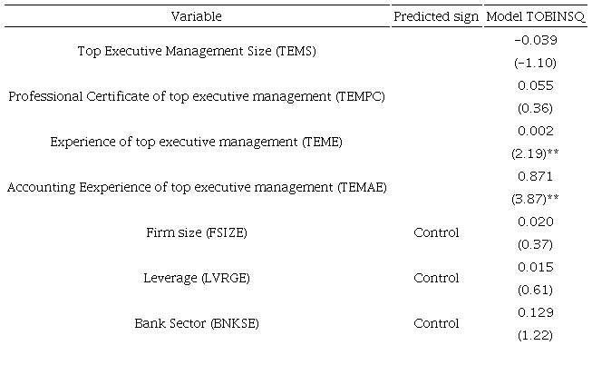 Based on the empirical findings, top executive management general and accounting experience positively and significantly related with the performance of the firms, but size and professional certificate of TEM lacked such relationship with the performance of the firms (refer to Table 7).
