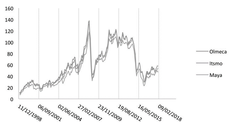 La Figura 1 muestra la evolución mensual de los precios en las tres modalidades de petróleo crudo que México exporta al continente Americano (Istmo, Maya y Olmeca) durante el periodo muestral. Las observaciones ascienden a 227 y están expresadas en dólares por barril, según datos obtenidos de la página web de Pemex (ver la sección de referencias). Del total de observaciones, 215 (94.74%) y 221 (97.37%) son usadas, sucesivamente, para calibrar los modelos estadísticos mientras que las restantes son consideradas para computar distintas métricas de errores en el pronóstico, como las sugeridas por Hansen (2005). Así que el análisis de esta sección está referido sólo a las 221 observaciones comprendidas entre enero de 1999 y junio de 2017.