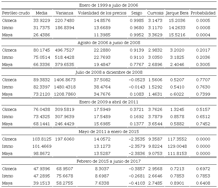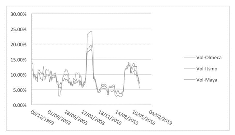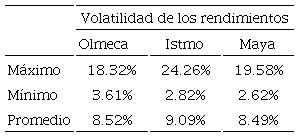De acuerdo con la Figura 1, los precios de las tres modalidades se mueven muy cercanamente y con la misma tendencia a lo largo del periodo. En particular, la media de precios más alta la registra la variedad Olmeca ($61.52) seguida de las del Istmo ($58.01) y Maya ($52.42), aunque con una gran volatilidad en los tres casos (32.29%, 31.65 % y 30.10%, respectivamente). Este último aspecto se vuelve más evidente si consideramos la volatilidad de los rendimientos para cada una de las modalidades, debido a que ahí queda claro que ésta alcanza un máximo de 24.26% en el Istmo y un mínimo de 2.62% en el Maya (ver Tabla 1).