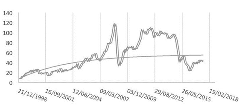Al considerar la serie de precios entre enero de 1999 y junio de 2017 observamos que el modelo de ajuste de la ecuación (8) desplegado en (13), si bien presenta un R2 muy alto (97.95%) está afectado por auto correlación serial y heteroscedasticidad. En efecto, al computar las pruebas de Durbin-Watson (DW), Breusch-Godfrey (BG) y las de White, tenemos que las hipótesis nulas de no auto correlación serial y homoscedasticidad son rechazadas consistentemente en (13). En concreto, para la prueba de auto correlación serial se encuentra que BG=55.08826> χ2=5.99 mientras que para la de homoscedasticidad el estadístico arroja el valor, con con T=221 y DW=1.0132.