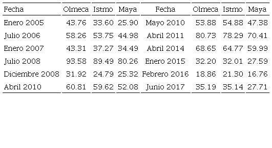 El resultado conjunto de estos vaivenes arroja un marcado patrón de alejamiento de la tendencia, seguido de un regreso no necesariamente duradero al nivel de precios de los periodos anteriores. Esto se puede constatar si se comparan los precios reales del Tabla 2, construidos con base en el índice de precios al productor de EEUU (Enero de 1999=100), para algunos años representativos de los seis sub-períodos. En efecto, en esa Tabla se observa que, para la modalidad Maya, hay un regreso múltiple a su nivel original de precios reales (2005) en los periodos cercanos a diciembre de 2008, enero de 2015 y junio de 2017, mientras que para la modalidad Olmeca, dicho regreso es más pronto (enero de 2007) aunque no tan recurrente como en el Maya. Finalmente, en la modalidad Istmo el regreso toma, en promedio, un intervalo de tiempo más largo que en el resto de las modalidades (10 años).