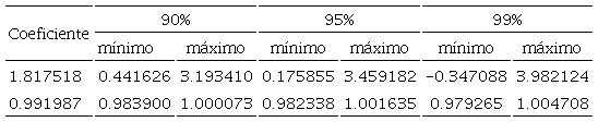 Asimismo, las estimaciones puntuales (P0.99(=0.991987 ≤ 0.998)=0.05) y de intervalo para los coeficientes de los parámetros auto regresivos son insesgadas respecto a la mediana para distintos niveles de confianza (ver Tabla 5), con lo que se confirma que el proceso no es de raíz unitaria.