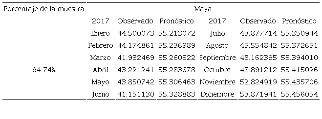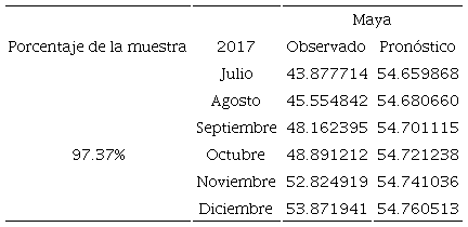 En las Tablas 6 y 7 se muestran los precios observados y pronosticados para esas ventanas con diferentes proporciones muestrales (97.37% y 94.74%). En ambas tablas se puede apreciar que las diferencias entre ambas series disminuyen sensiblemente al término del periodo pronosticado. En particular destaca el hecho que la especificación (14) muestra una convergencia más acelerada que la de (15), como lo constatan los menores valores de MSE, RMSE, MAD y MAPE en la Tabla 8 para el pronóstico que incluye el 97.37% de la muestra.