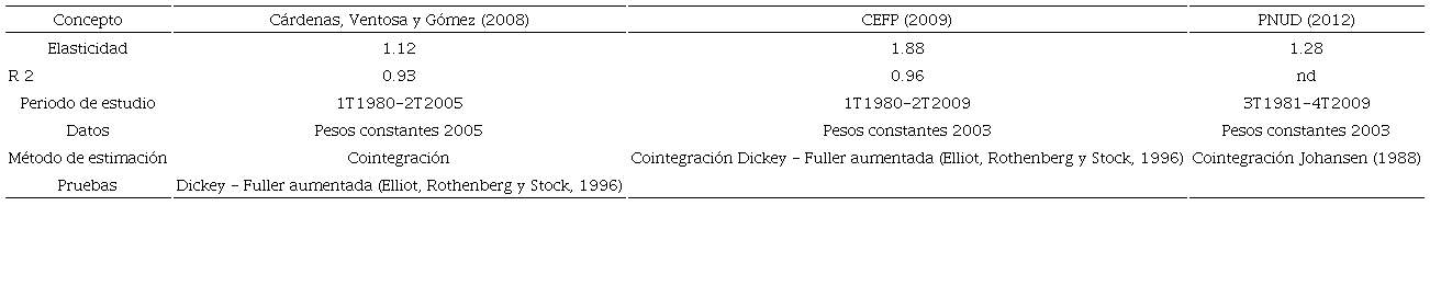 Los trabajos de Cárdenas, Ventosa y Gómez (2008), del Centro de Estudios de las Finanzas Públicas (CEFP, 2009) y del PNUD (Sacasa, 2012) permiten concluir que es factible estimar la elasticidad ingreso entre el crecimiento económico y la recaudación del Impuesto al Valor Agregado (IVA). Los tres estudios identificados en la literatura siguieron la metodología de cointegración y sus resultados facilitan la conclusión de que la relación entre ambas variables es positiva y ante movimientos en el PIB se generan movimientos en la recaudación del impuesto.