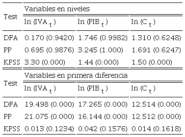 En la Tabla 2a se puede observar que las series de tiempo del modelo especificado no son estacionarias en niveles, pero sí en primeras diferencias, como se reporta en (Cárdenas, Ventosa y Gómez, 2008), (CEFP, 2009) y (Sacasa, 2012).