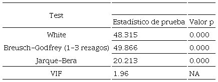 En la Tabla 2b se muestra que los residuales de la regresión de la ecuación (1) presentan problemas de heterocedasticidad, normalidad y correlación serial, pues en cada caso se rechaza la hipótesis nula. No obstante, no existen problemas de multicolinealidad, pues el estadístico VIF es menor a diez.