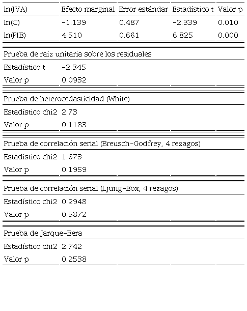 El Programa de Naciones Unidas para el Desarrollo (Sacasa, 2012) también estudió la relación del IVA con el PIB para el periodo del tercer trimestre de 1981 al cuarto trimestre de 2009, con cifras expresadas a pesos constantes de 2003, bajo un modelo en el cual se considera la recaudación del IVA como una función del nivel de ingreso, medido a través del PIB. La estimación de la elasticidad se realizó bajo el procedimiento de Johansen (1988), atendiendo la presencia de series no estacionarias, para obtener un vector de cointegración, el cual mediante el teorema de Engle y Granger (1987) el vector de cointegración se consideró como un mecanismo de corrección de errores. Por lo tanto, dado que el PIB y la recaudación del IVA son series no estacionarias I(1), se especificó un modelo de cointegración que utilizó el procedimiento de Johansen (1988) para su estimación. Normalizando el vector de cointegración se concluyó que existe una relación estable a largo plazo entre la recaudación del IVA con el PIB y los resultados concluyeron que “ante el aumento de un punto porcentual en el PIB, la recaudación a largo plazo del IVA se incrementa 1.28% (Sacasa, 2012).