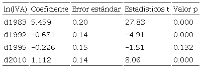 Respecto de la eliminación de la variable de control d1995 por su no significancia estadística, se determinó no eliminarla por la siguiente razón: económicamente tiene relevancia mantenerla dentro de la estimación debido a que en 1995 se registró la mayor caída en el PIB desde los años treinta y a pesar de que se aumentó la tasa impositiva del 10% al 15% para fortalecer las finanzas públicas, los efectos en la recaudación del IVA de ese año fueron poco significativos ya que se alcanzó una cifra del 2.2% como proporción del PIB, cifra muy similar a la registrada en 1994 con una tasa impositiva del 10%, comportamiento que puede justificar la no significancia estadística de esta variable de control.
