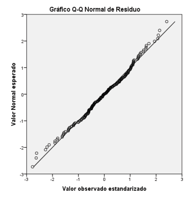 Así mismo, la Figura 1 se presenta el gráfico de los residuales que refleja que la mayoría de los valores observados se encuentran cerca de la recta diagonal que representa los valores esperados si la distribución fuese normal.