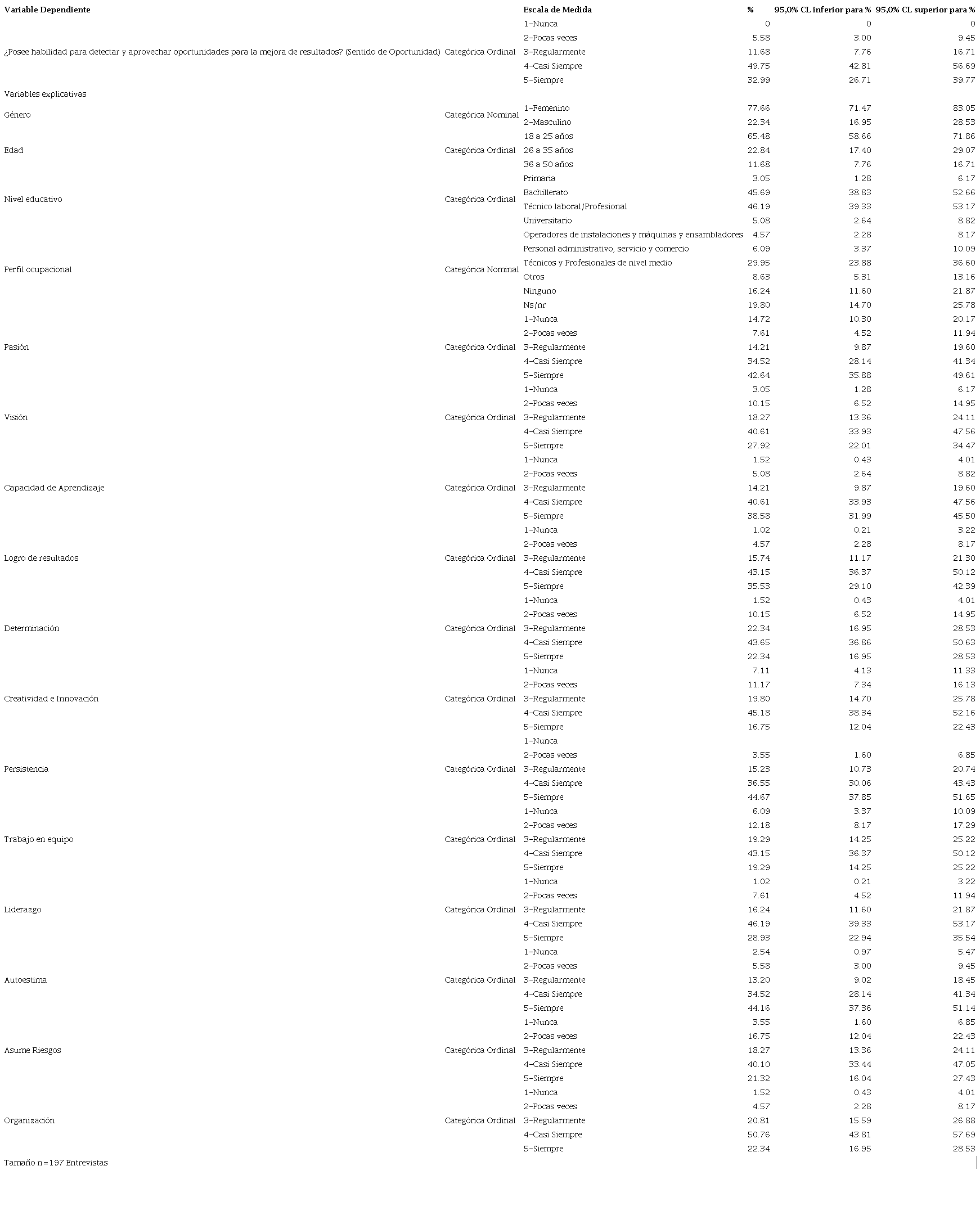 Por lo tanto, el objetivo planteado es determinar la relación entre la variable dependiente la percepción de la habilidad para detectar y aprovechar oportunidades para la mejora de los resultados y las variables independientes: género, edad, nivel educativo, perfil ocupacional, pasión, visión, capacidad de aprendizaje, logro de resultados, determinación, creatividad e innovación, persistencia, trabajo en equipo, liderazgo, autoestima, asumir riesgos y organización.