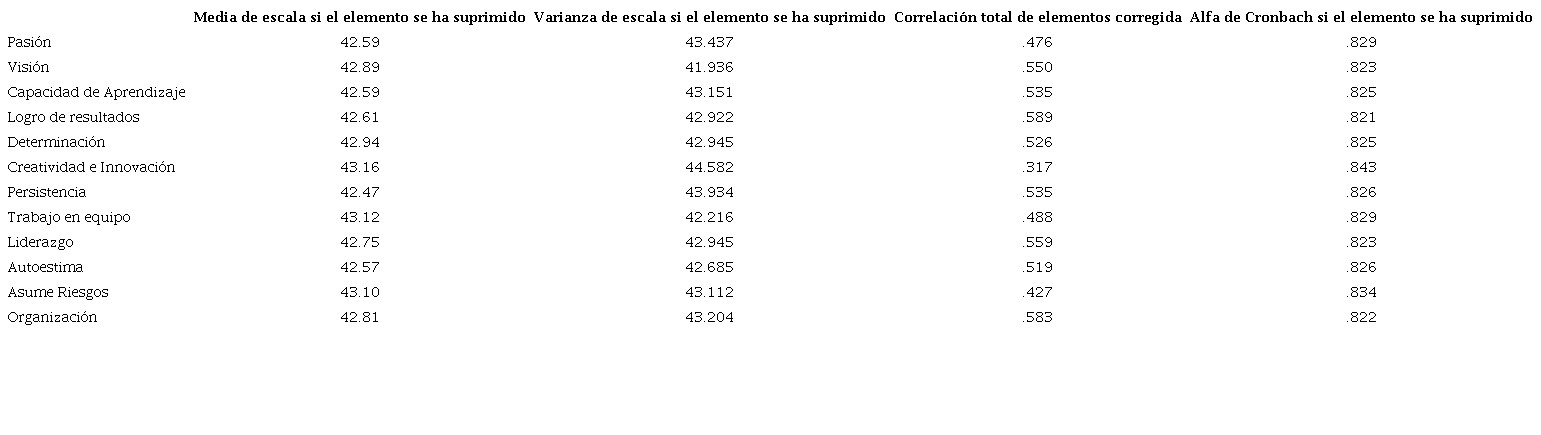 La evaluación de fiabilidad del instrumento de medida se realizó mediante el método basado en el estadístico alfa de Cronbach, presentando un alto nivel de consistencia interna de la escala alfa de Cronbach de .839 en 12 elementos (Tabla 2).