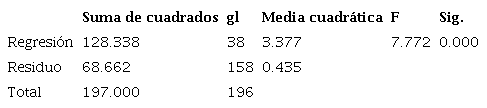Los resultados del modelo CatReg inicial propuesto resulta significativo en el análisis ANOVA (F = 7.772, p < .05) (ver Tabla 3), presentando un coeficiente de determinación ajustado es decir que el 56.80% de la variabilidad de la variable dependiente “habilidad para detectar y aprovechar oportunidades para la mejora de los resultados” es explicada por todas las variables incluidas en el modelo inicial.