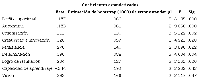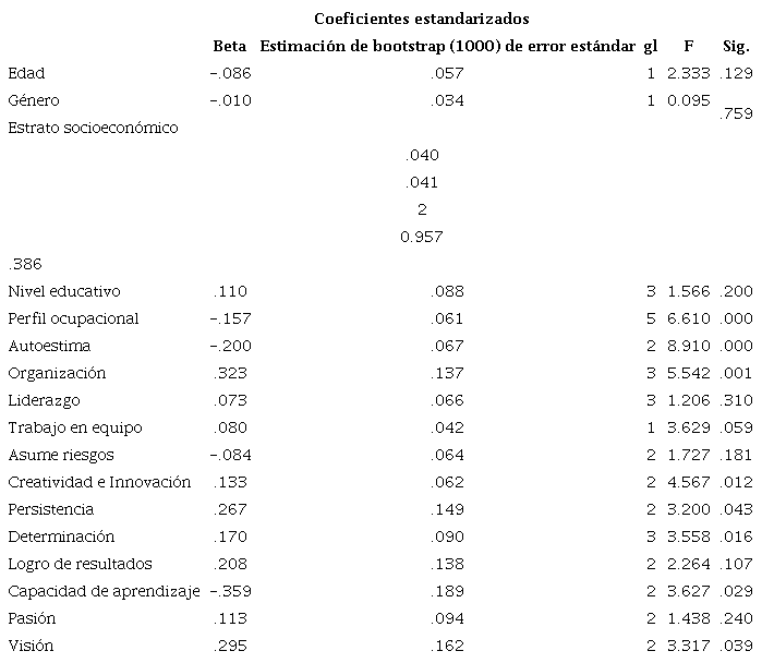 La Tabla 4, presenta las contribuciones parciales a la explicación de la varianza de todos los coeficientes estandarizados de las variables transformadas, indicando que la mayoría de las variables propuestas presentan aportes estadísticamente significativos al modelo (p < .05), con la excepción de las variables 1) edad, 2) género, 3) estrato socioeconómico, 4) nivel educativo, 5) liderazgo, 6) trabajo en equipo, 7) asume riesgos y 8) pasión, (p > .05) en el modelo inicial.
