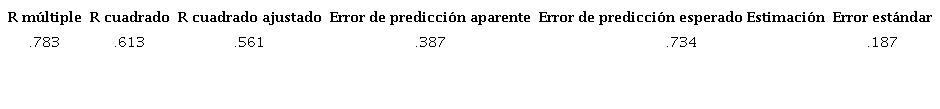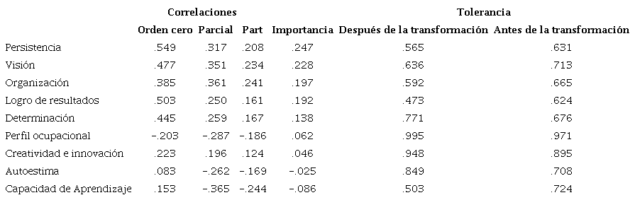 Seguidamente, la Tabla 7 muestra las correlaciones de orden cero, donde la mayor correlación entre el predictor transformado (variable dependiente) y la respuesta transformada, se produce para las variables independientes: 1) persistencia; 2) logros de resultados; y 3) determinación. Las medidas de importancia relativa de Pratt, defiine la importancia de los predictores de forma aditiva, el conjunto de predictores: 1) persistencia; 2) visión; 3) organización y 4) logro de resultados, aportan el 86.4 % del modelo para explicar la “habilidad para detectar y aprovechar oportunidades para la mejora de los resultados” (variable dependiente).