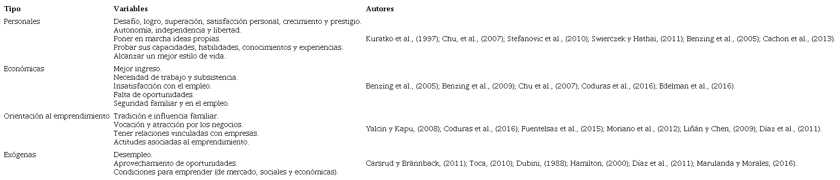 Las motivaciones han sido tema de interés de muchos investigadores, quienes buscan conocer más sobre lo que impulsa a las personas a emprender, los problemas asociados al emprendimiento (Yalcin y Kapu (2008) y los factores de su éxito (Benzing, Chu y Kara, 2009). La motivación es reconocida como la fuerza necesaria para emprender, sortear las dificultades y uno de los más grandes predictores de los resultados y del éxito de la actividad emprendedora (Marulanda y Morales, 2016). En virtud de ello, han surgido distintas posturas que buscan conceptualizar y agrupar las motivaciones para emprender. Por ejemplo, Kuratko, Hornsby y Naffziger (1997), plantean la existencia de cuatro tipos de motivaciones: de recompensa extrínseca, intrínseca, autonomía y seguridad familiar. Yalcin y Kapu (2008), las agrupan en aspectos financieros, de reconocimiento, libertad y tradición familiar, mientras que otros las clasifican como “push” y “pull” factors. En las primeras, incluyen el desempleo, el crecimiento profesional y la insatisfacción laboral. Y como pull factors, están el deseo de independencia, de superación y las expectativas por alcanzar prestigio y beneficios económicos (Amit y Muller, 1995; Marulanda, Montoya y Vélez, 2014b). Bajo estas aproximaciones, se ha evidenciado que las motivaciones para iniciar una empresa están relacionadas principalmente con la búsqueda de un mejor ingreso, la seguridad en el empleo y la necesidad de trabajo y/o subsistencia (Benzing, Chu y Callanan, 2005; Benzing et al., 2009; Chu, Benzing y McGee, 2007). Así también, con el surgimiento de oportunidades y aspectos vinculados a la economía o el entorno (Coduras, Sainz y Ruiz, 2016; Carsrud y Brännback, 2011; Toca, 2010; Marulanda y Morales, 2016).
