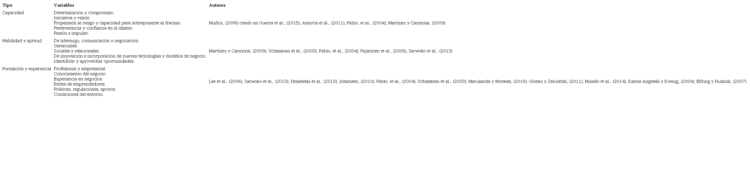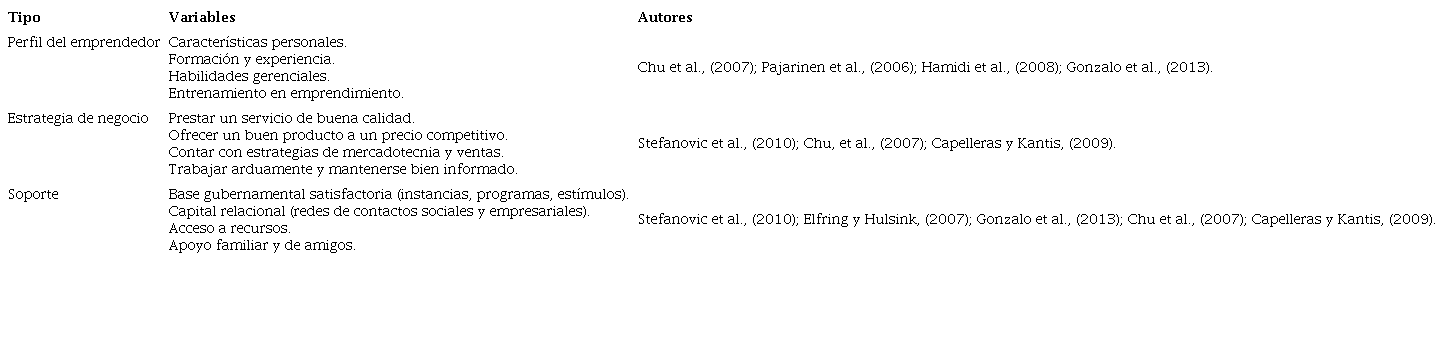 La evidencia empírica ha demostrado que en la experiencia emprendedora confluyen diversos elementos. Entre las variables estudiadas vinculadas a los emprendimientos no fallidos están el perfil del emprendedor; sus características personales; formación y experiencia previa en la iniciación y gestión de empresas (Chu et al., 2007; Stefanovic et al., 2010; Gonzalo, Federico y Kantis, 2013; Hamidi, Wennberg y Berglund, 2008). También, se refiere la estrategia de negocio de la cual dependen los factores críticos del éxito emprendedor relacionados con el servicio y la atención al cliente; el ofertar un buen producto a un precio competitivo; contar con una infraestructura de soporte sólida, así como estrategias de mercadotecnia y ventas efectivas (Stefanovic et al., 2010). A la par de trabajar duramente, mantenerse siempre bien informado, conocer el entorno y tener redes de contactos sociales y empresariales; además de otros aspectos estratégicos (Stefanovic et al., 2010; Chu, et al., 2007; Capelleras y Kantis, 2009) como acceso a recursos (financieros, humanos, de información) y estar integrado a una red de emprendedores (Gonzalo et al., 2013; Elfring y Hulsink, 2007), entre otros. La Tabla 3, concentra los factores de éxito citados en investigaciones previas.